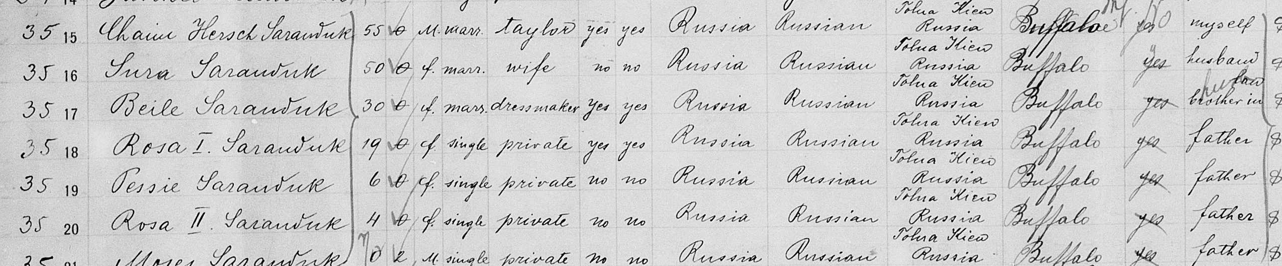 The manifest listed Chaim Hersch Saranduk (age 55), his wife Sura (age 50), a married daughter-in-law Beila, and daughters Rosa and Pessie — all bound for Buffalo, NY. On the same manifest, his son Schmarje (Sam Shore, age 38) and wife Tube (Tillie, age 33) traveled with their six young children, bound for Providence, RI.