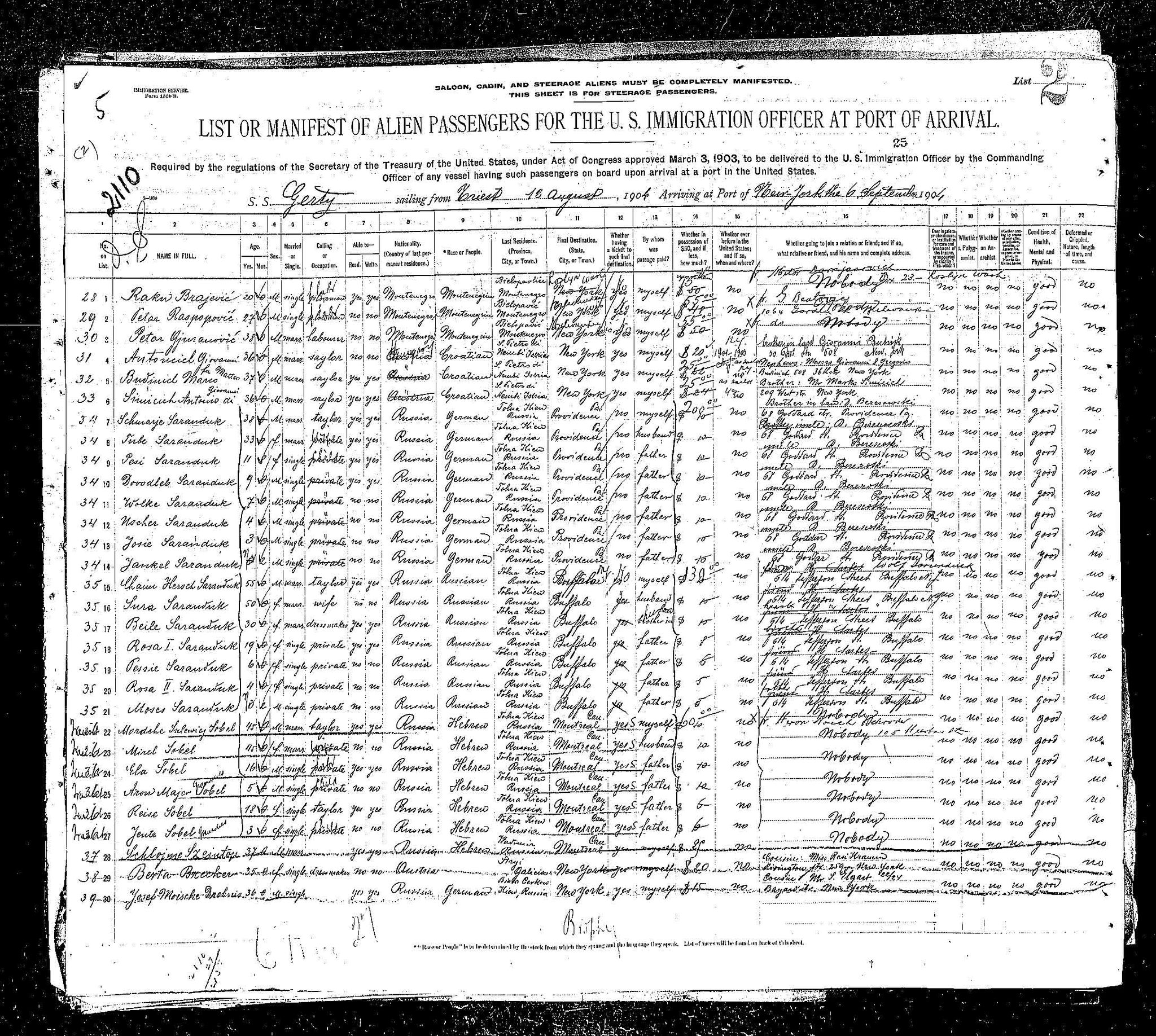 The starting point was the passenger manifest of the ship they arrived on: the S.S. Gerty, which sailed from Trieste on August 18, 1904, and arrived in New York on September 6, 1904. Three generations of Saranduks were traveling on the same ship, which gave us a great deal to work with.