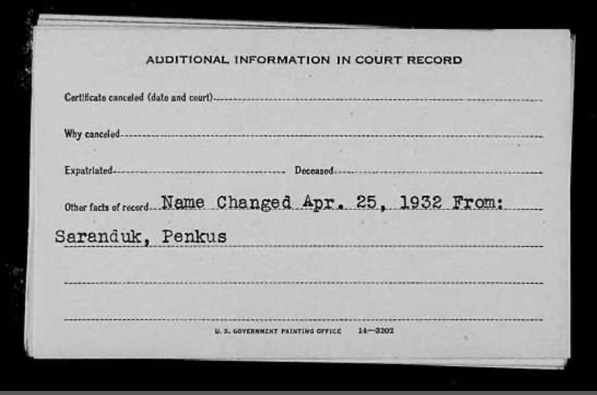 The earliest known spelling, in the 1818 Torgovitsa Revision List, is Srondik (СРОНДИК), already suggesting that the written form was somewhat arbitrary. In America, the Saranduk name was dropped immediately — though a few documents capture the transition explicitly, most notably Philip Shore’s naturalization papers.