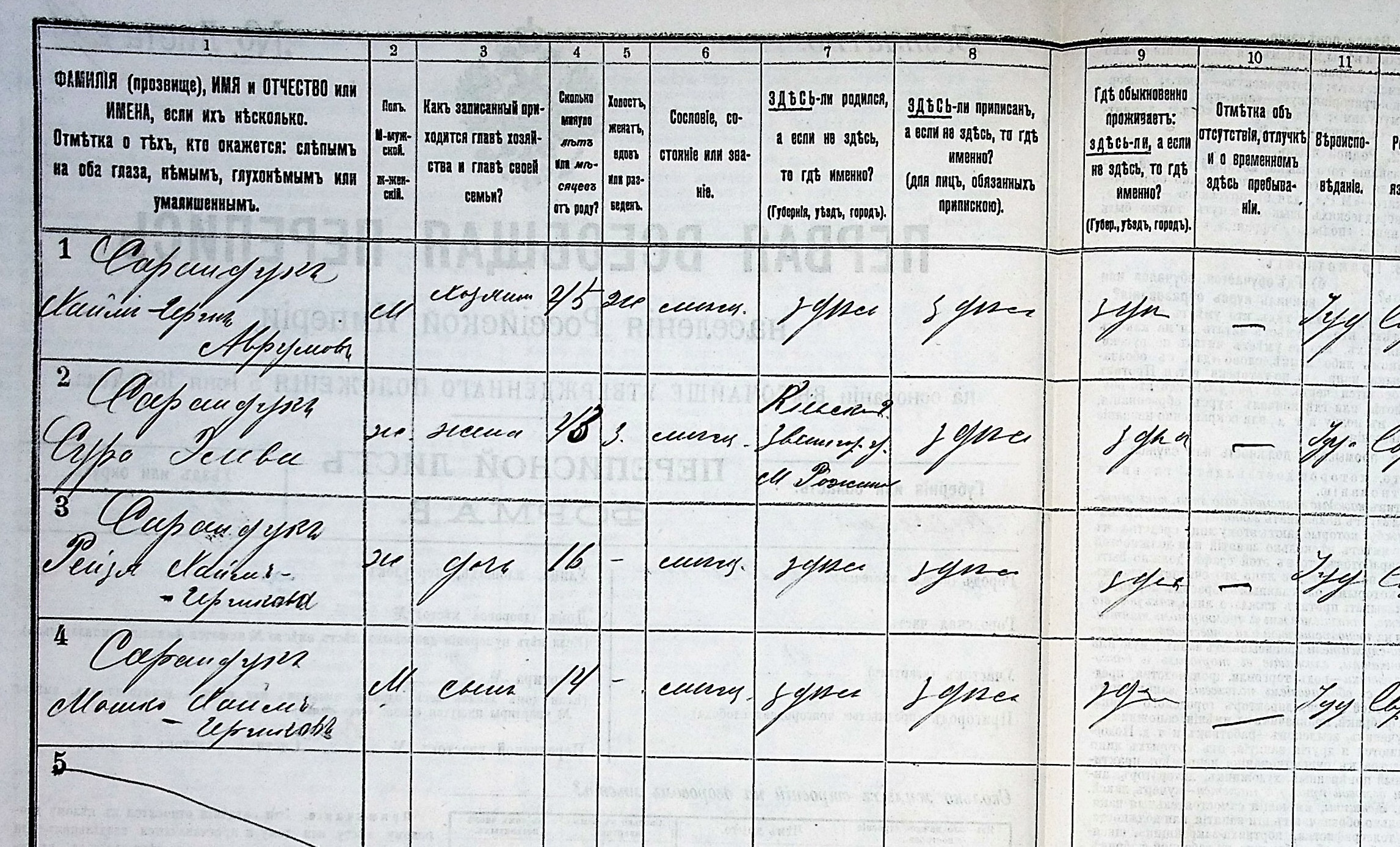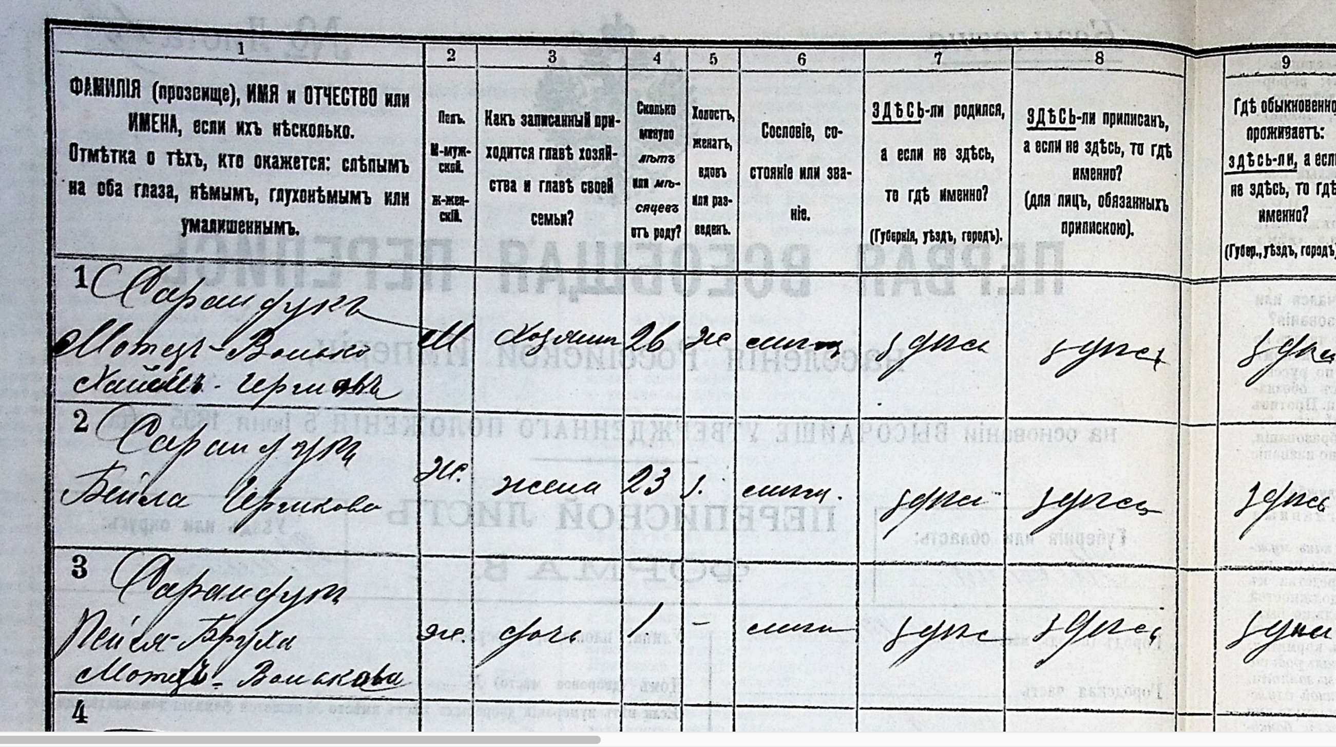 The 1850 record was a recent addition to the JewishGen database and revealed for the first time that Hyman Shore had an older sister named Malka (b. ~1844). The same 1897 round of records also captured a separate household: Motez Volko Saranduk (Mordechai Ze’ev), age 26, son of Khaim Gersh — Hyman Shore’s son William, who had emigrated ~1902 and whose American descendants took the name Serin rather than Shore.